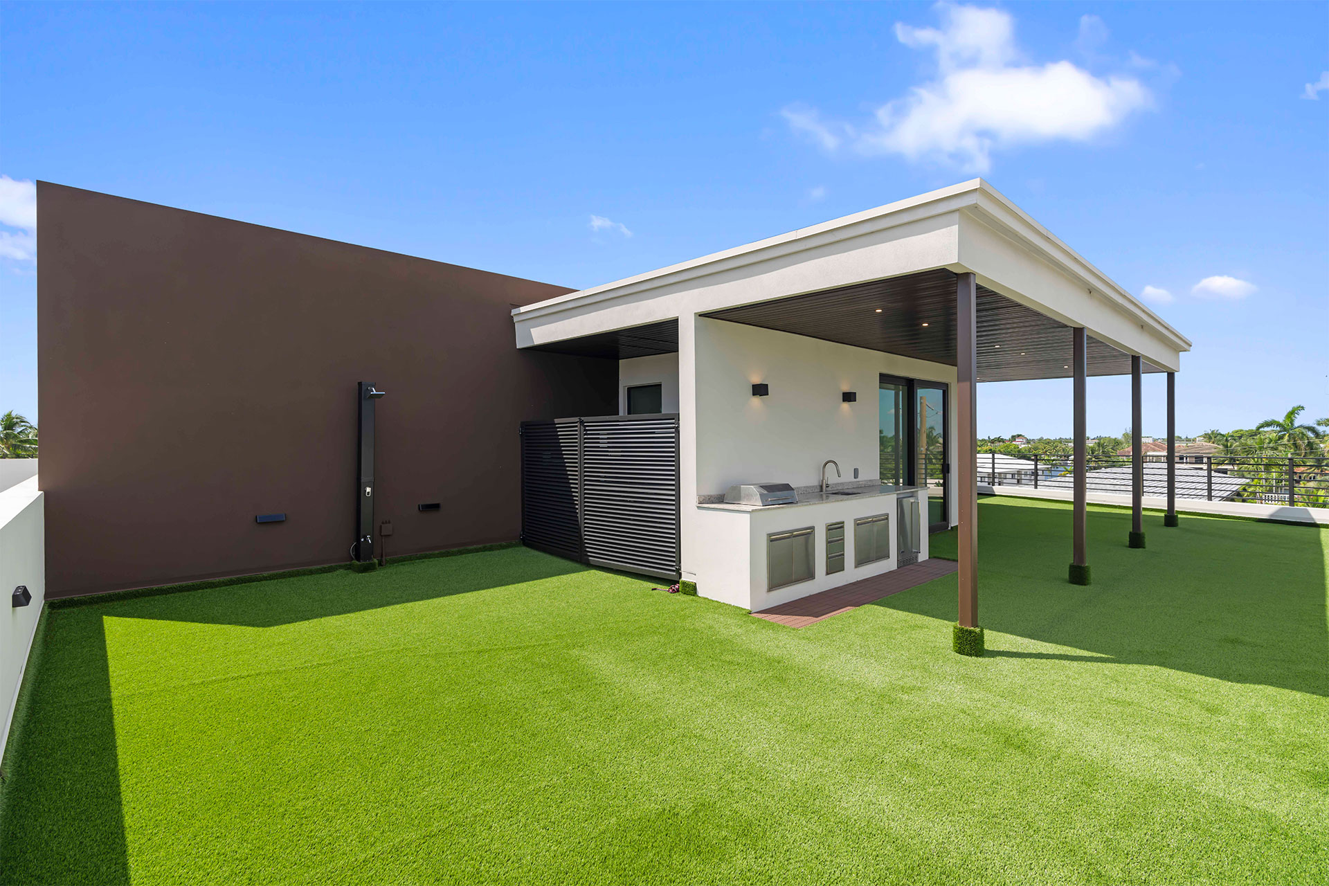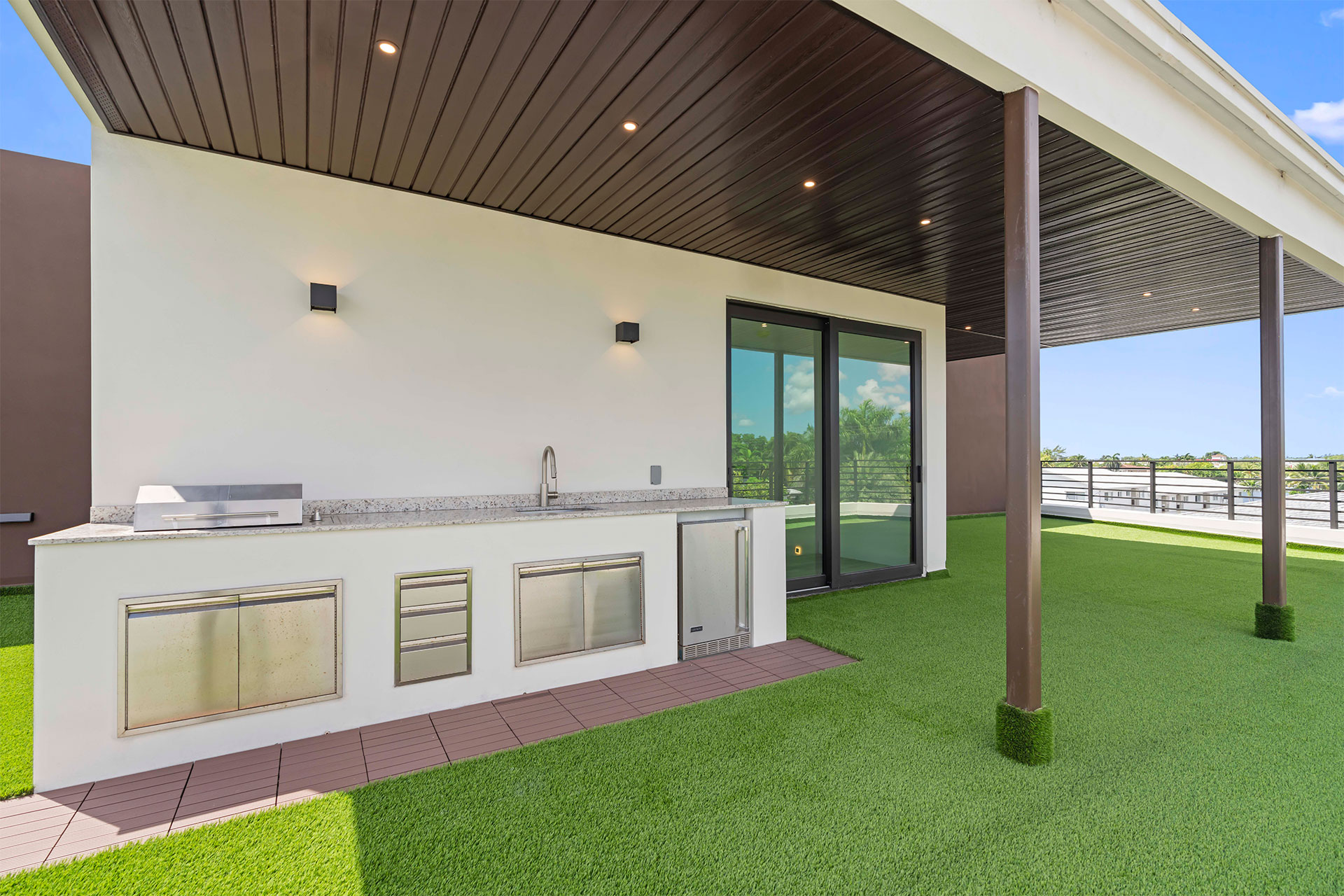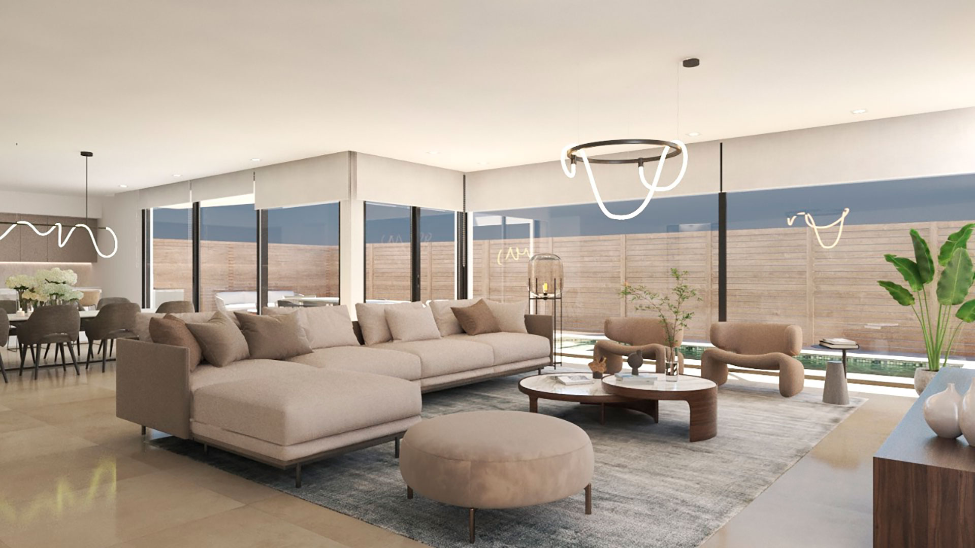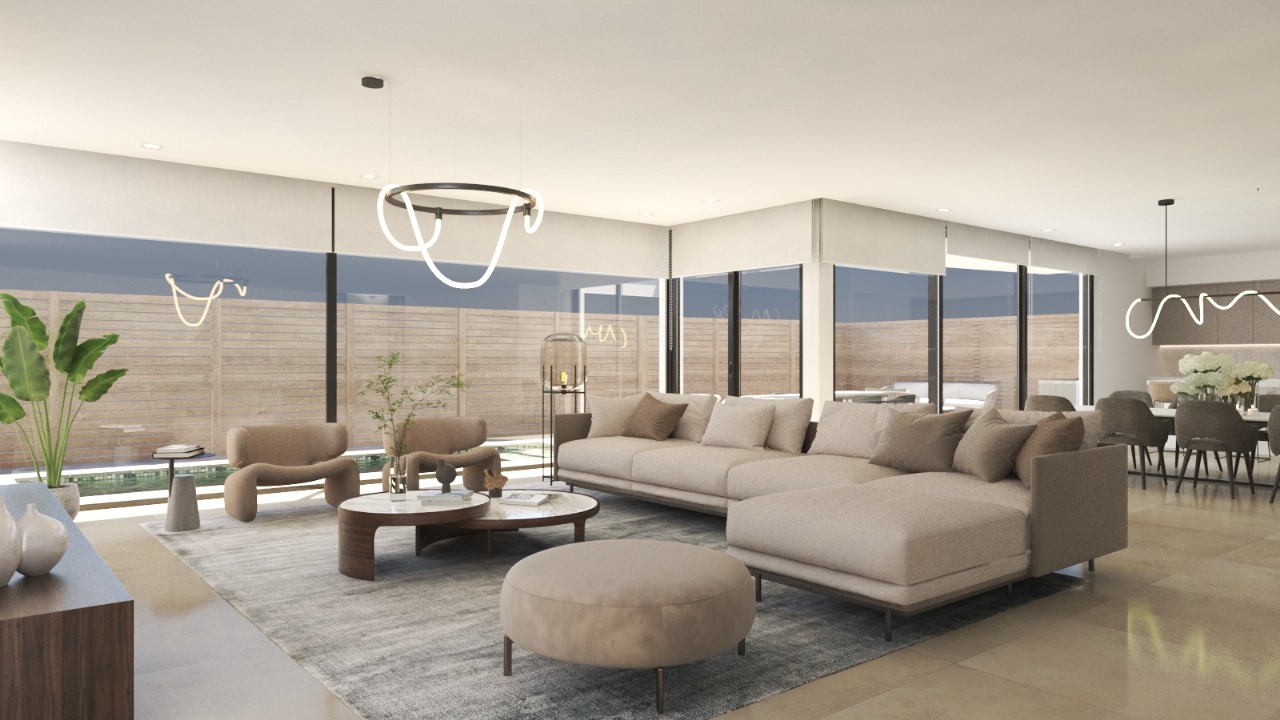This villa offers 3.250 SF of living space and a total of 5.764 SF, featuring a garage for five vehicles, a modern kitchen, a bright living-dining room, a private pool, and a rooftop with a grill and space for a jacuzzi. Perfect for unforgettable nights under the stars.